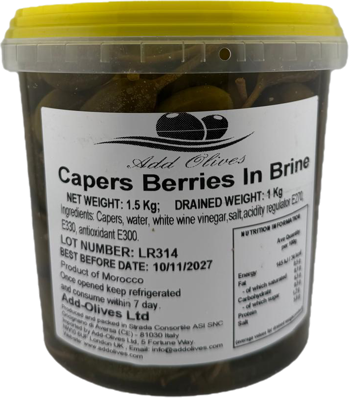 Large, olive-sized fruits from caper plant with stems attached for presentation. Mild, tangy flavor less intense than traditional capers. Perfect for charcuterie boards, cocktail garnishes, and antipasto platters. Adds Mediterranean elegance and sophisticated briny taste to appetizers.