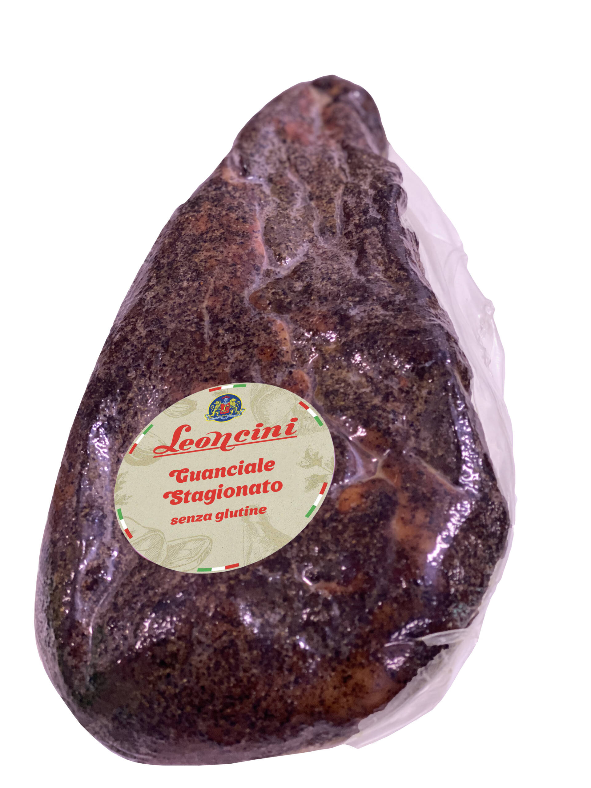 Guanciale, offering tender marbled texture, rich savory flavor, delicate cured pork taste, and aromatic smoky aroma, ideal for pasta, antipasti, salads, Mediterranean dishes, charcuterie boards, and gourmet Italian culinary preparations serving.