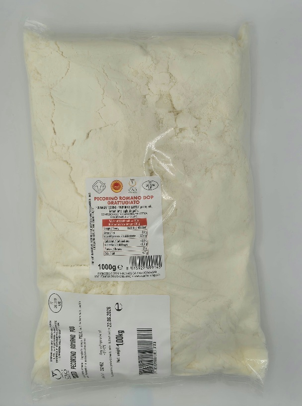 Pecorino Romano grated, offering fine granular texture, sharp salty flavor, rich umami taste, and aromatic aroma, ideal for sprinkling over pasta, salads, soups, risottos, antipasti, cheese boards, and Mediterranean dishes serving.