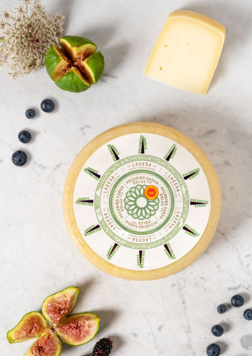 Pecorino Sardo Cuore di Bortigialli whole wheel, offering firm crumbly texture, rich tangy flavor, savory aged taste, and aromatic aroma, ideal for slicing, grating, antipasti, salads, pasta, cheese boards, and gourmet Mediterranean dishes serving.