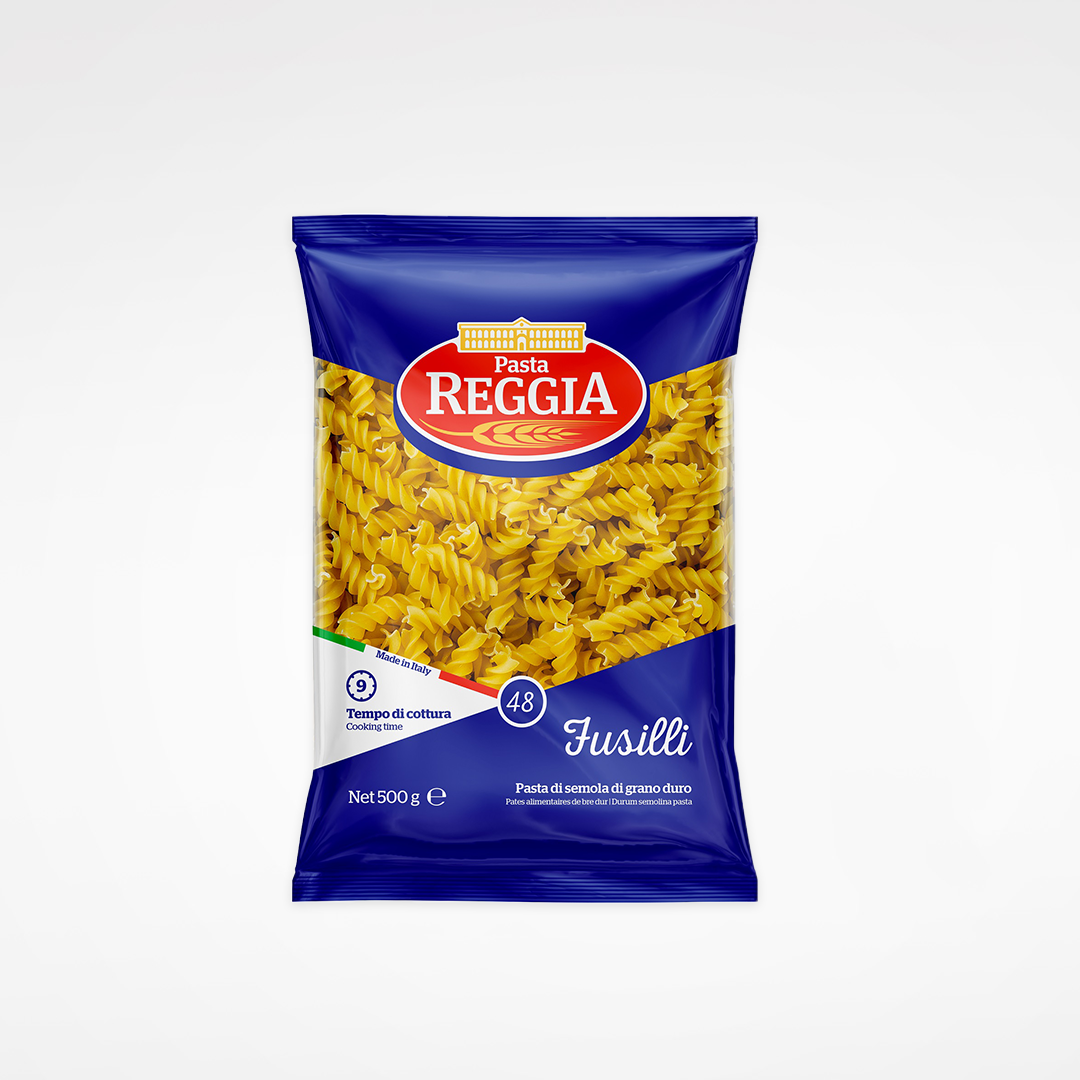 Reggia Fusilli, offering firm al dente texture, mild wheaty flavor, and fresh aroma, ideal for boiling, pairing with sauces, Mediterranean dishes, pasta salads, baked recipes, and gourmet Italian culinary preparations serving.