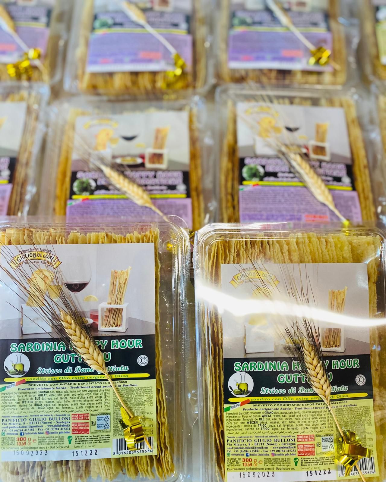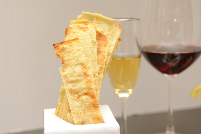 Sardinian Pane Guttiau strips—long, crisp, and golden with a rich buttery flavour and light seasoning. Perfect for snacking, antipasti, salads, soups, cheese boards, or elegant appetiser platters. From Panificio Bulloni